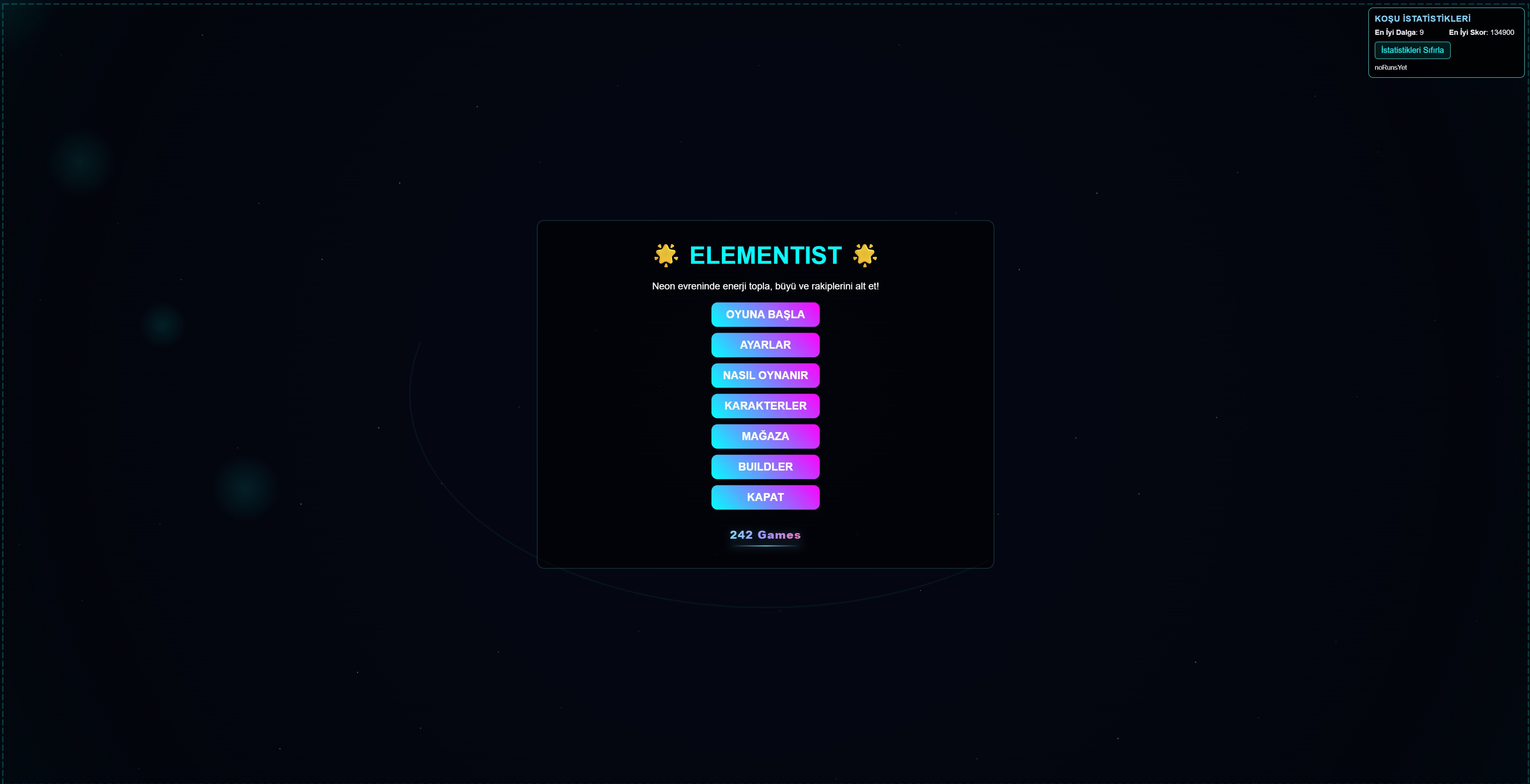 Elementist A neon sci-fi wave-based roguelite survival game for fans of Brotato and Vampire Survivors! **Features:** - Element selection (Fire/Water/Air) and character classes with diverse builds - Rich shop system (re-save, lock, consumables) - Multiple map/background variations - Cosmetic skins (escape routes, weapons, animations) - 4K cutscenes and voice acting with 8 language support (Turkish, English, German, Japanese, Hindi, Spanish, Chinese) - Mobile-friendly touch controls (joystick + skill/escape buttons) Survive, upgrade, and complete 20 waves! Looking forward to your feedback 🚀